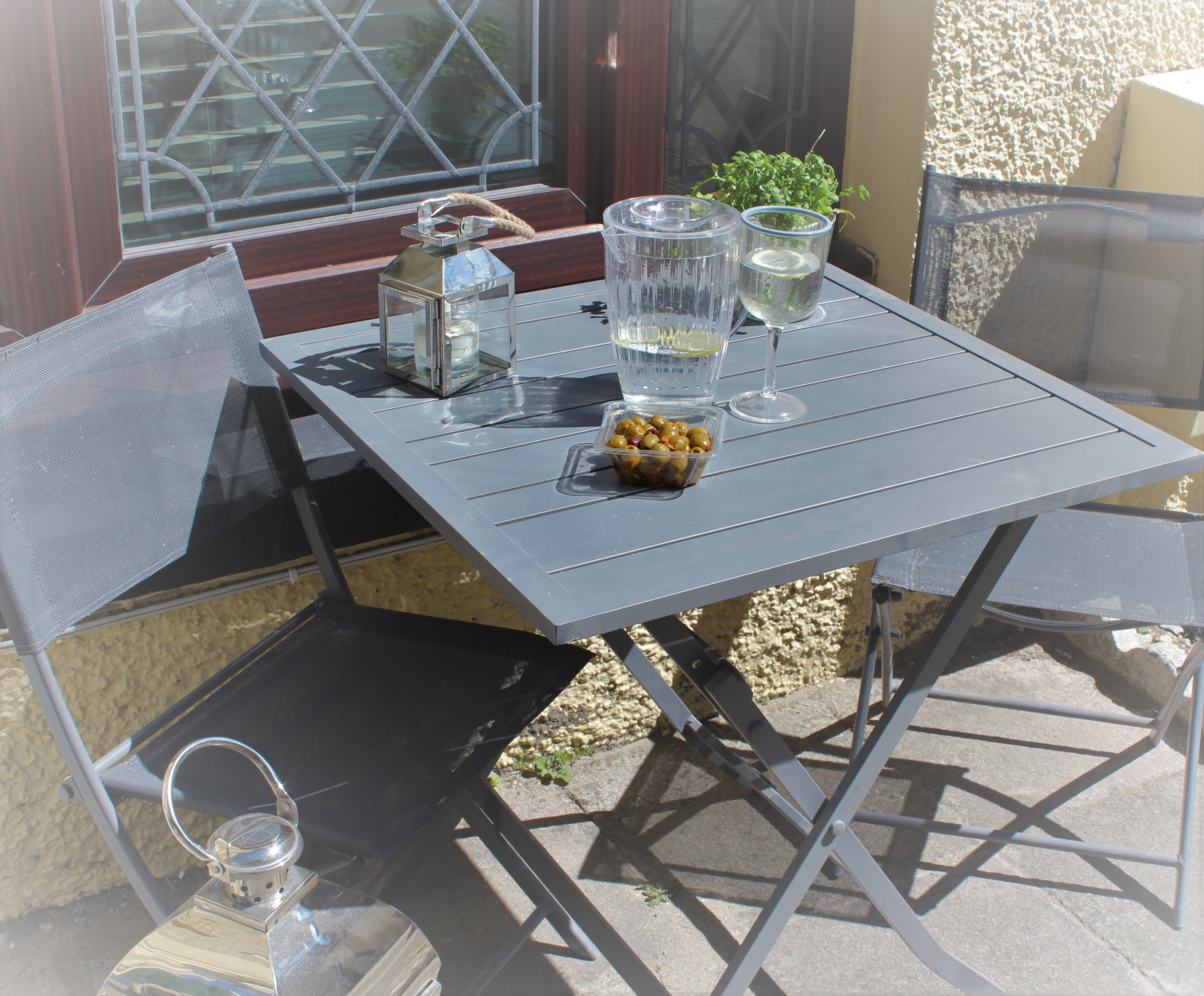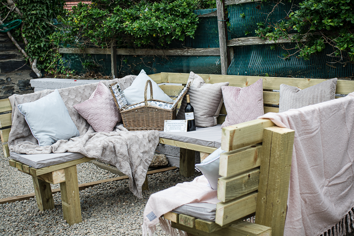 Seaview garden with comfortable handmade furniture and stored cushions for your use